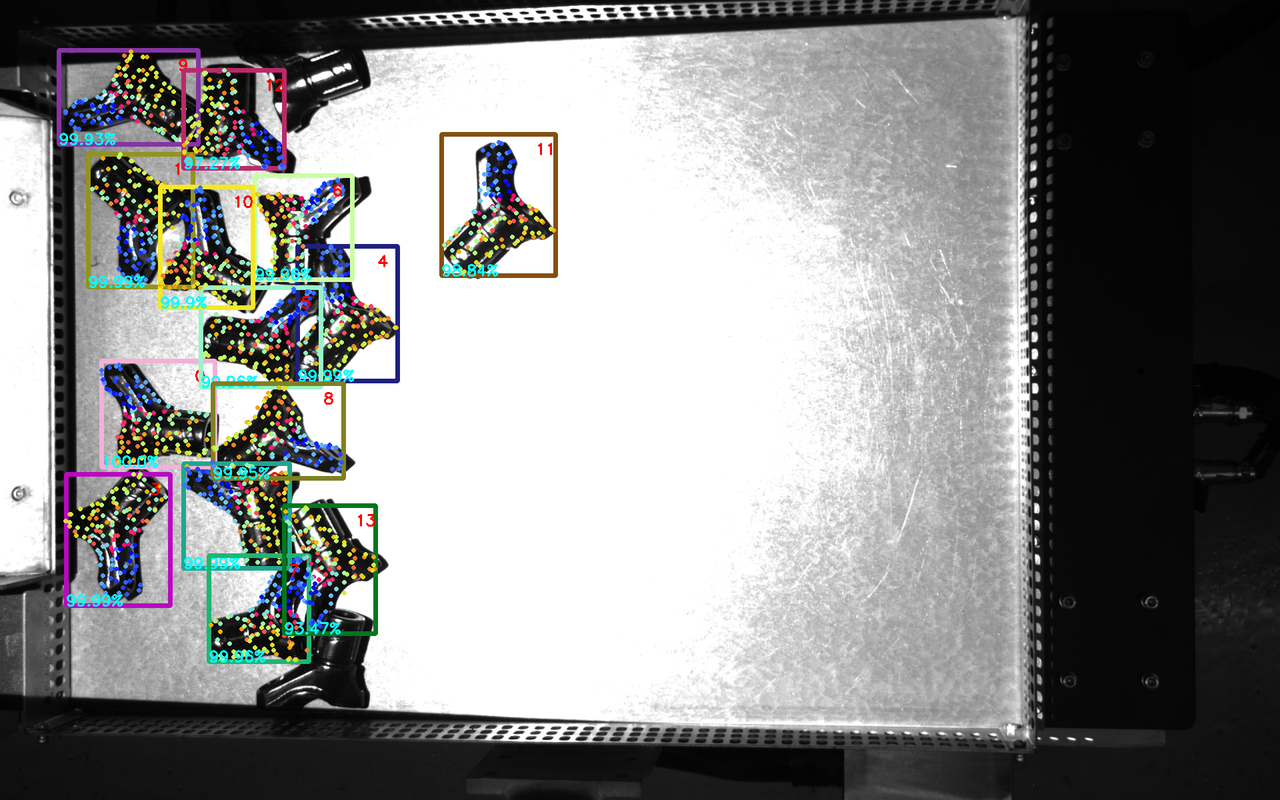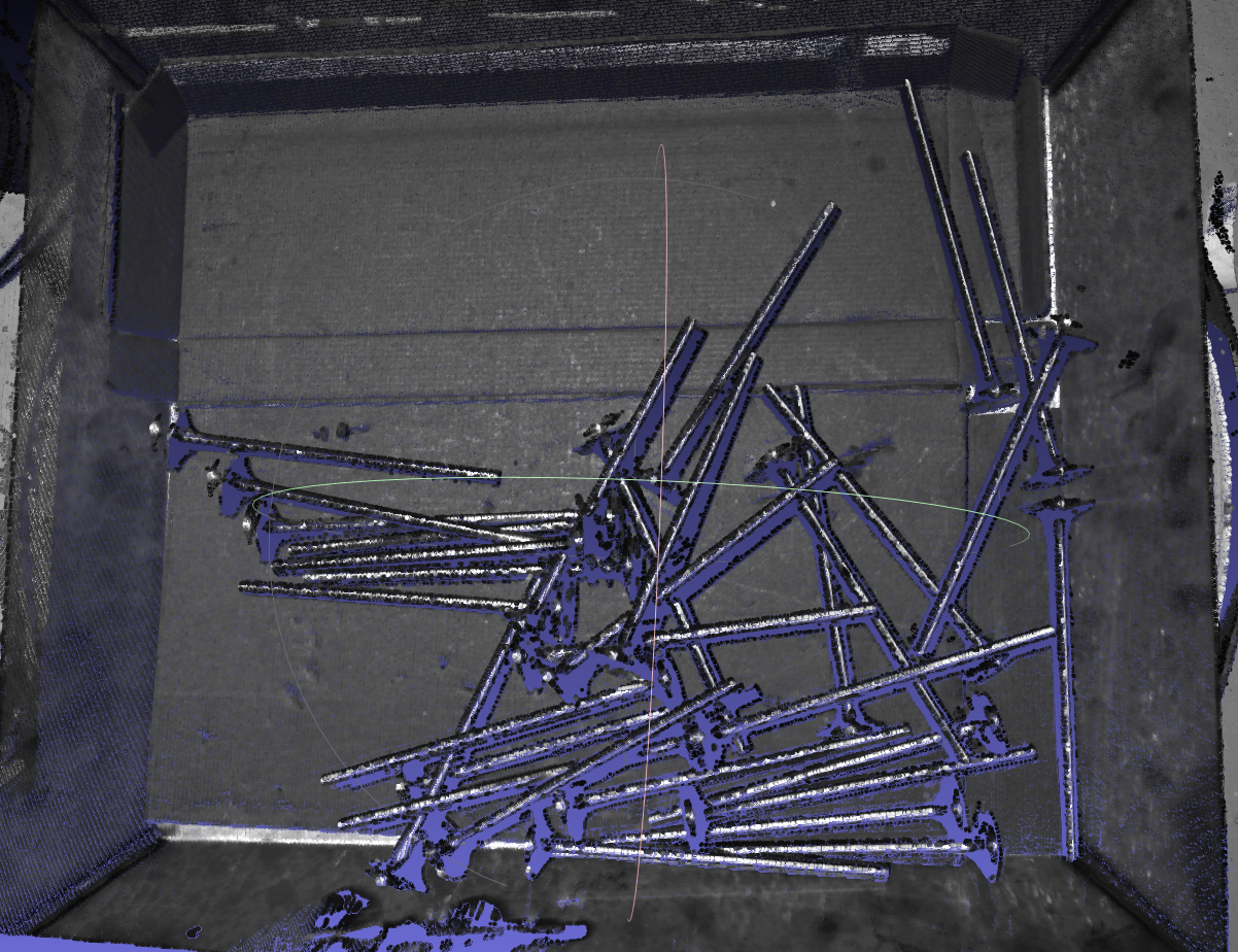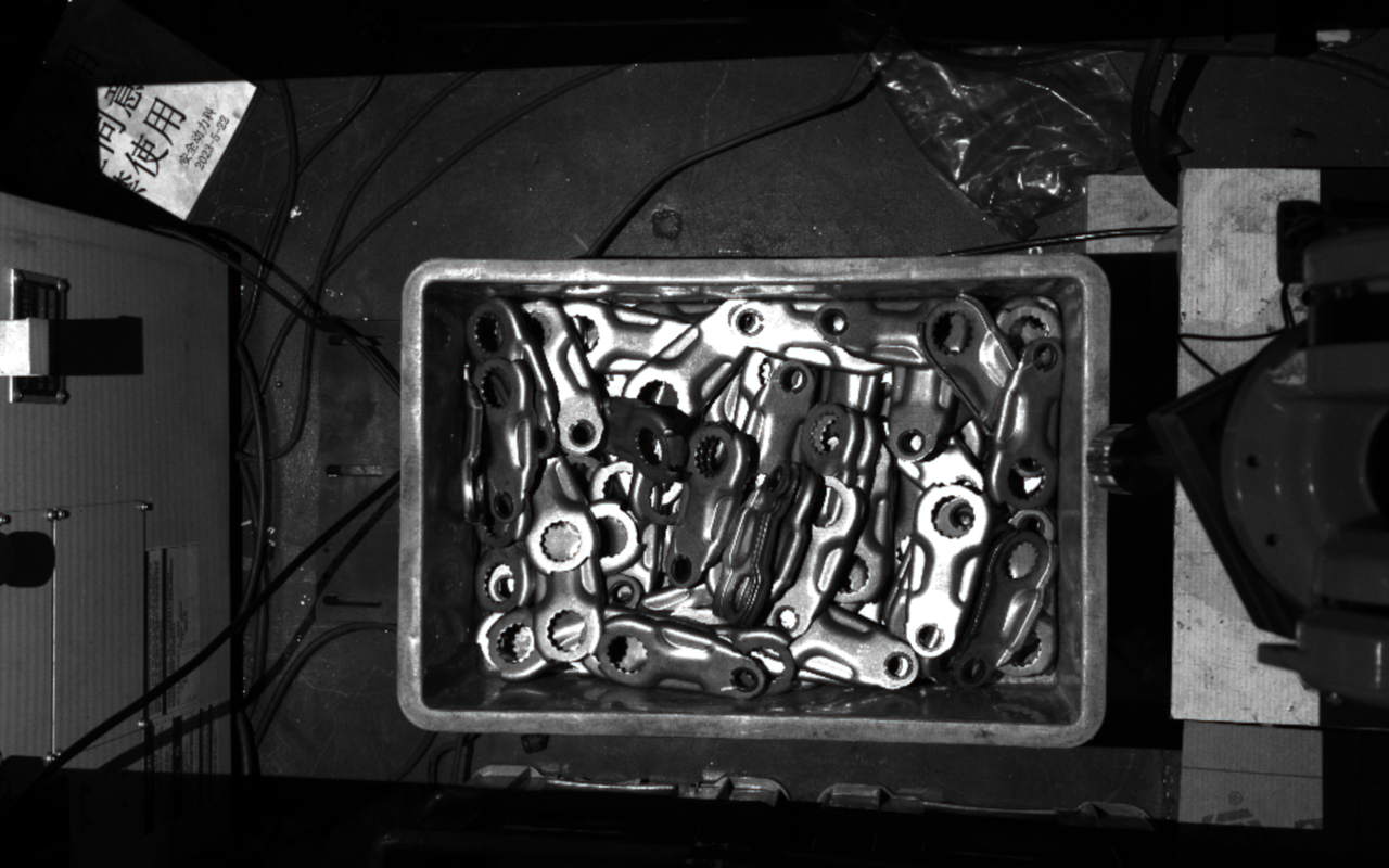 | 相机成像点云效果 | 通过3D相机(如结构光、双目视觉等)对目标工件进行识别后,所获取的点云数据的质量与完整性。 | 点云缺失 常见原因: 工件属性(高反光、透光材质导致激光无法返回)。 环境光干扰(强光照射导致传感器饱和)。 视角遮挡(工件自遮挡或外部物体遮挡)。 优化策略: 调整光源:使用漫射光或偏振滤光减少反光影响。 局部模板:使用可视区效果较好的点云做模板。 点云深度不连续、噪声大 常见原因: 工件属性(多层结构、透明/半透明材质)。 相机超出视差范围(测量距离过近/远导致点云失真)。 物体叠层遮挡(如堆叠工件导致点云混合)。 优化策略: 滤波去噪:使用滤波和剔除离群点功能优化点云质量。 深度校准:确保相机在最佳工作距离内采集数据。 分层分析:对叠层工件分区域提取点云,避免误匹配。 |