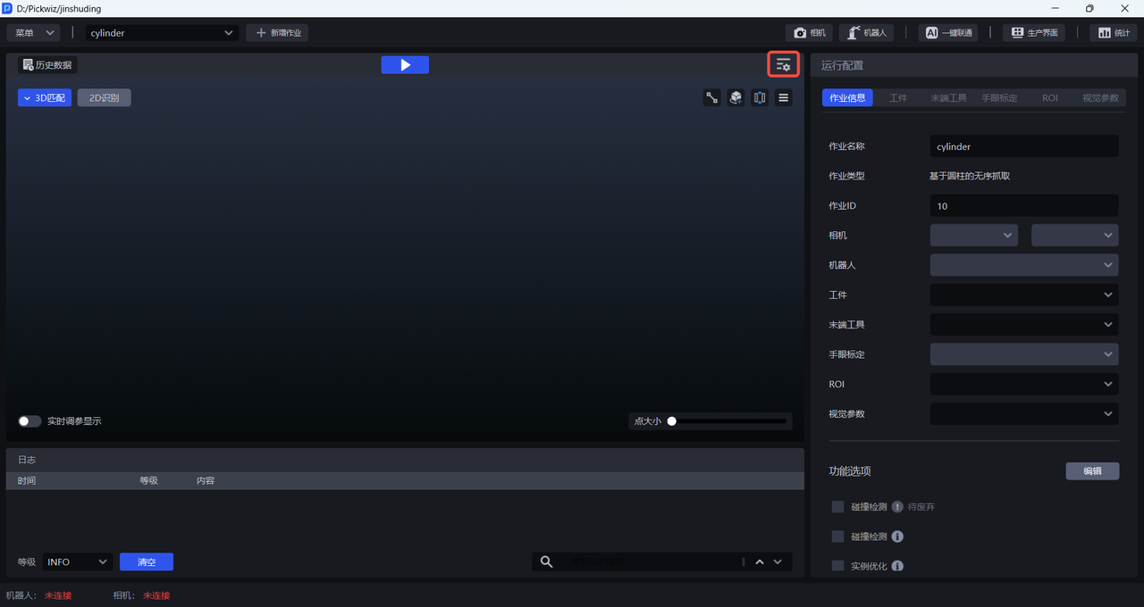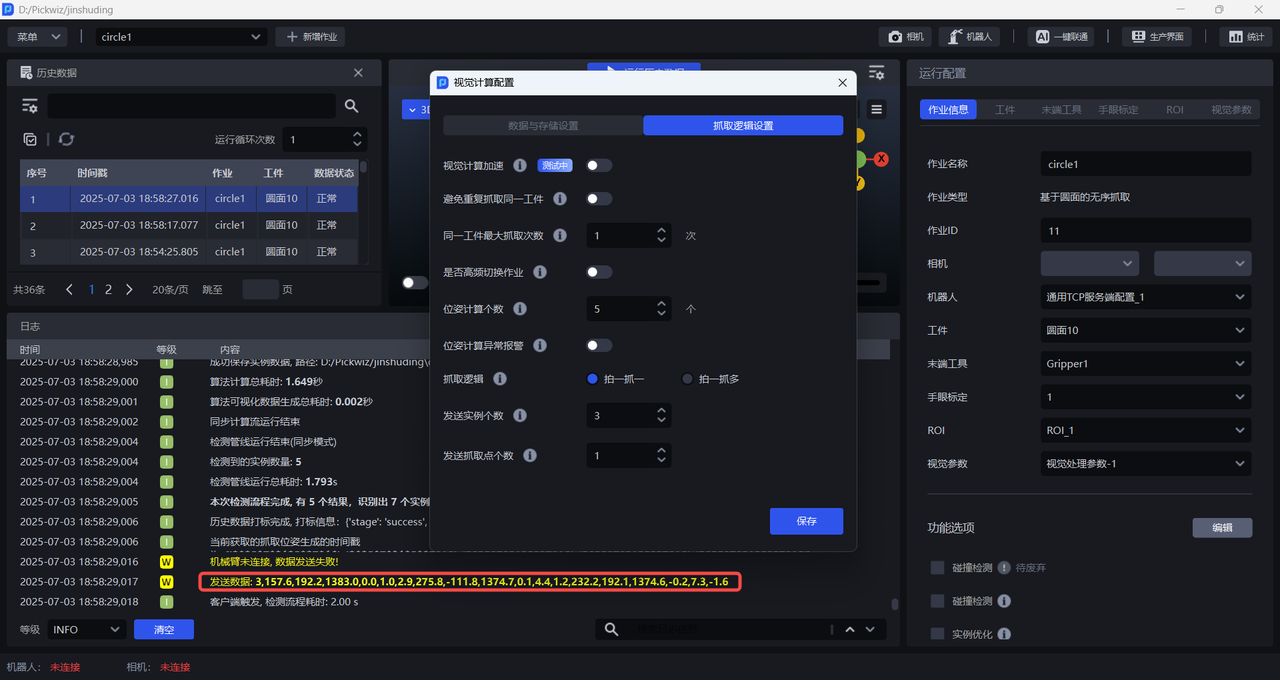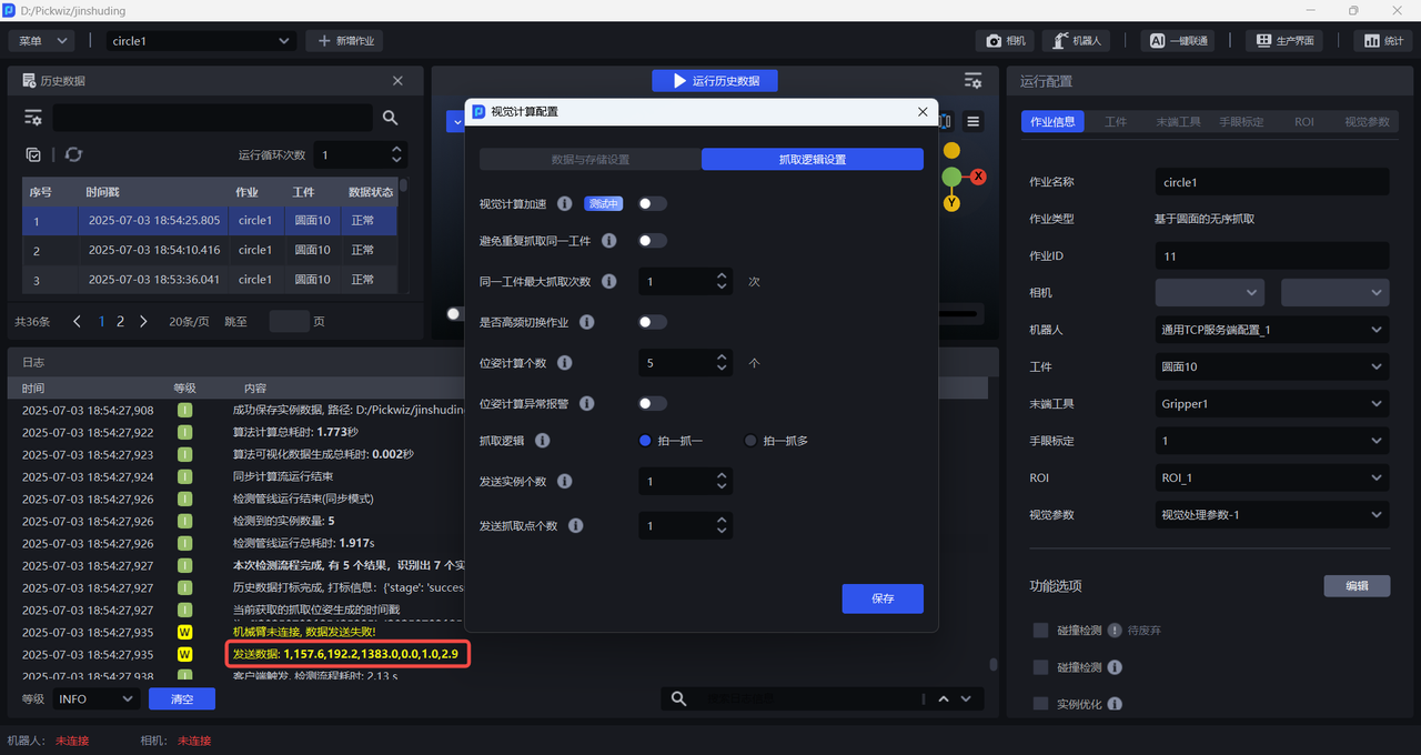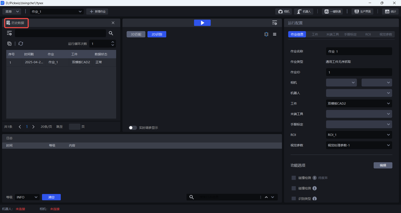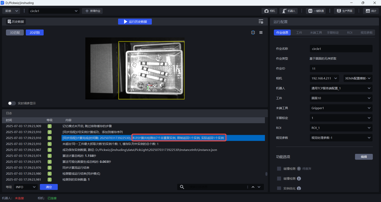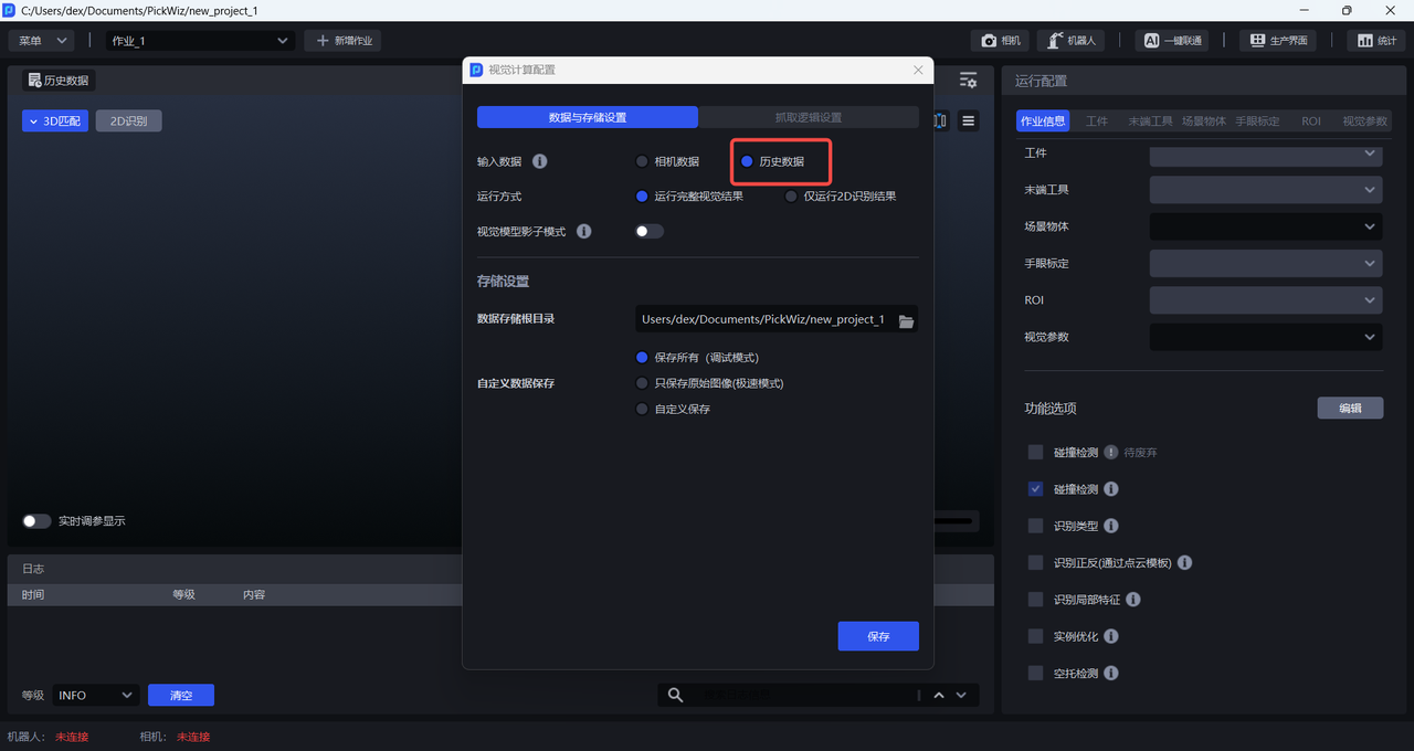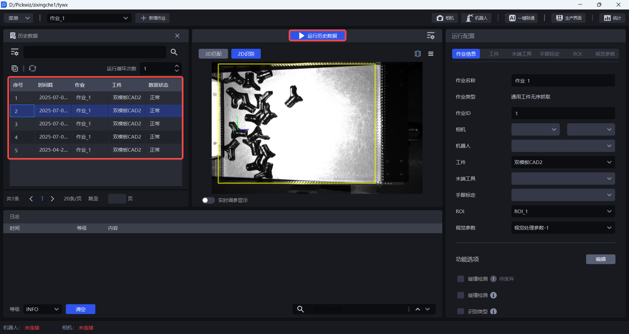 输入历史数据进行视觉计算前,无需连接相机和机器人,也无需配置作业信息,工作流会使用当前作业配置对历史数据进行视觉计算。