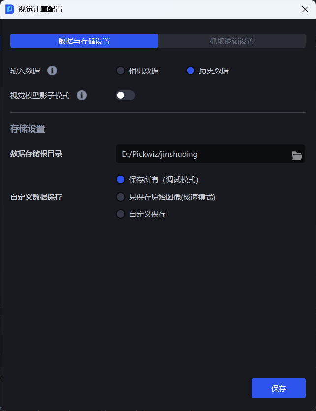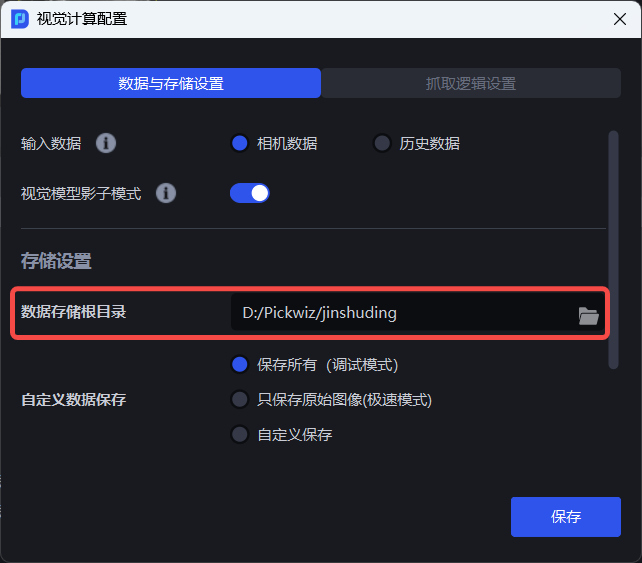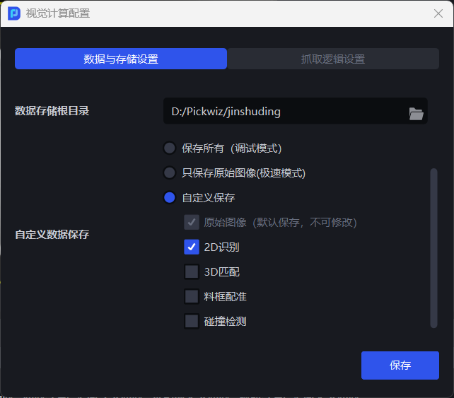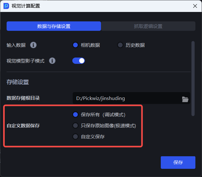 自定义数据保存即保存视觉计算过程中的内容,可选择 保存所有(调试模式)、只保存原始图像(极速模式)、自定义保存。