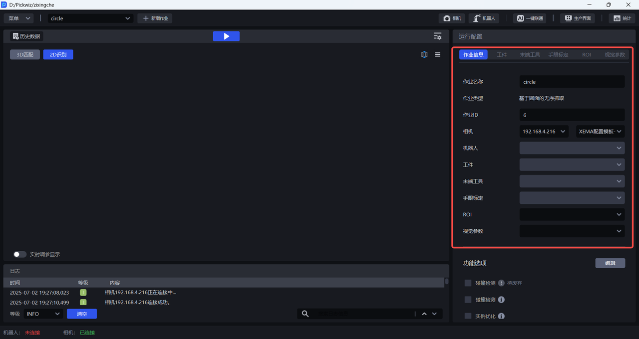 (1)新建项目和作业,连接相机和机器人并配置完成作业信息,具体操作请参照 项目操作指南、 作业操作指南、 相机连接与调参指南、 机器人配置与通信操作指南。