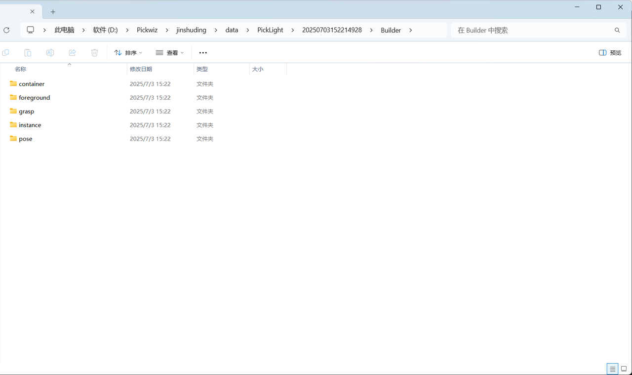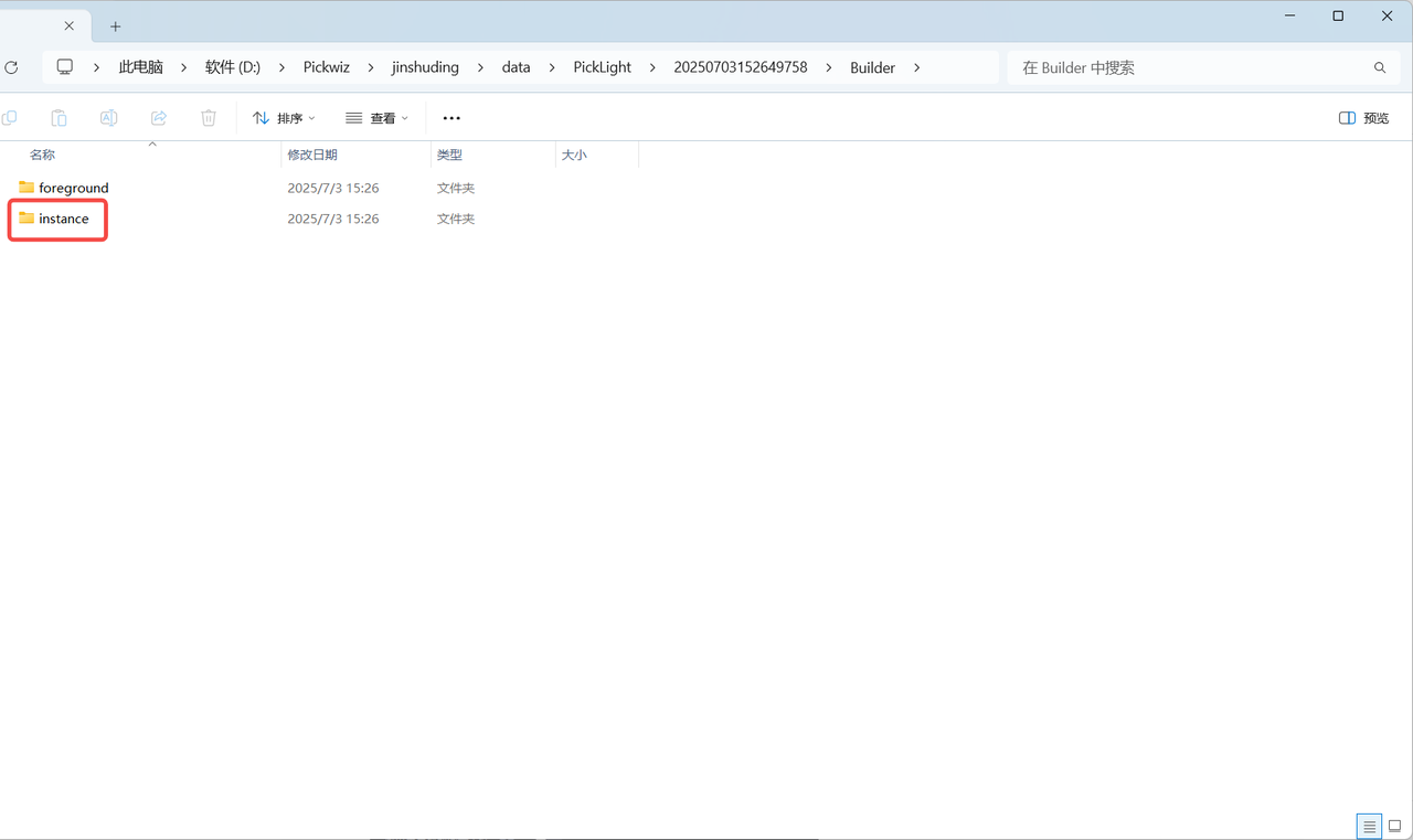 选择 仅运行2D识别结果 ,只会保存该条历史数据重新运行的2D识别结果(Builder文件夹只保存前景节点foreground、料框检测container、实例检测instance,不保存姿态估计节点pose、抓取点生成节点grasp),如下图所示。