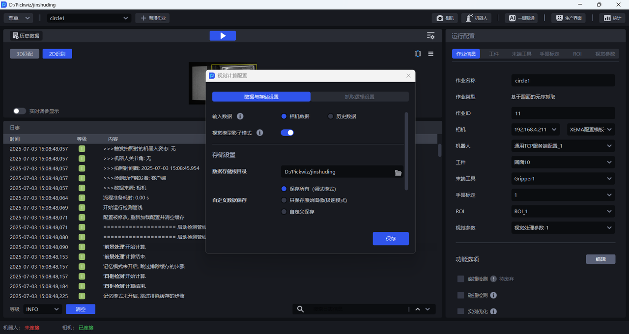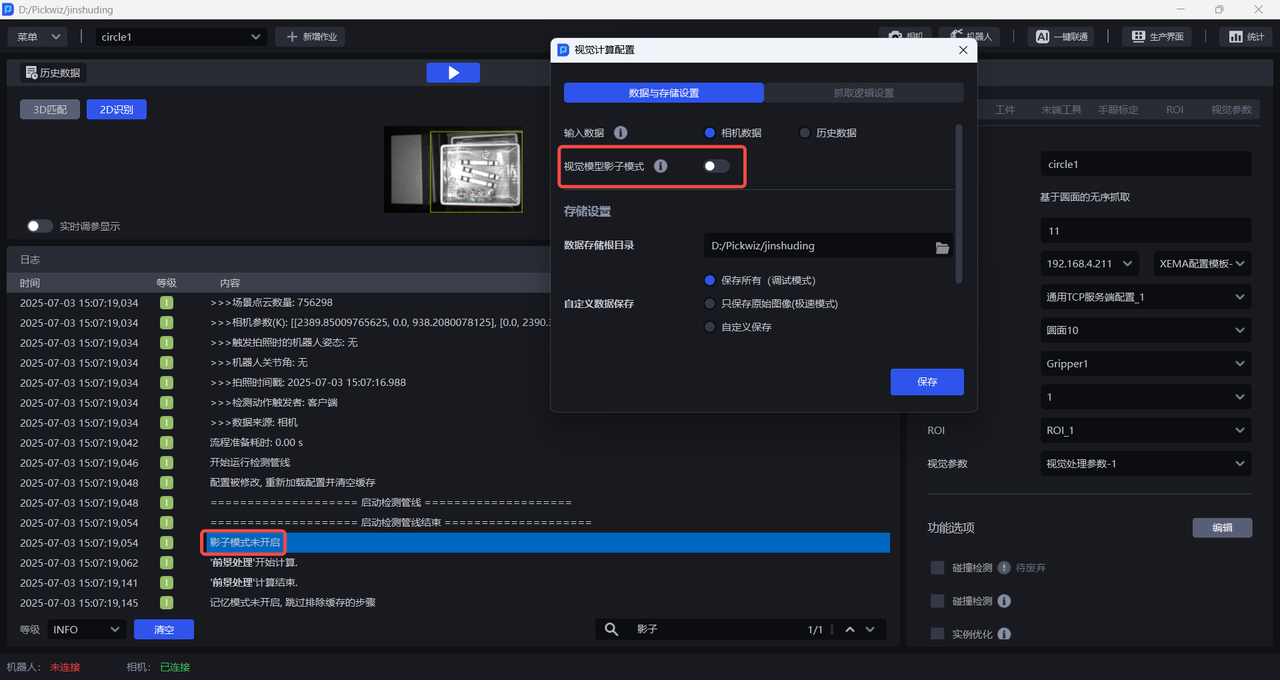 开启后,系统将保存作业运行的数据,其中机器人触发的数据会运用于工件模块下的视觉模型影子训练,优化模型识别效果。