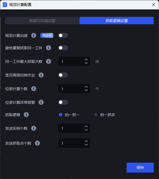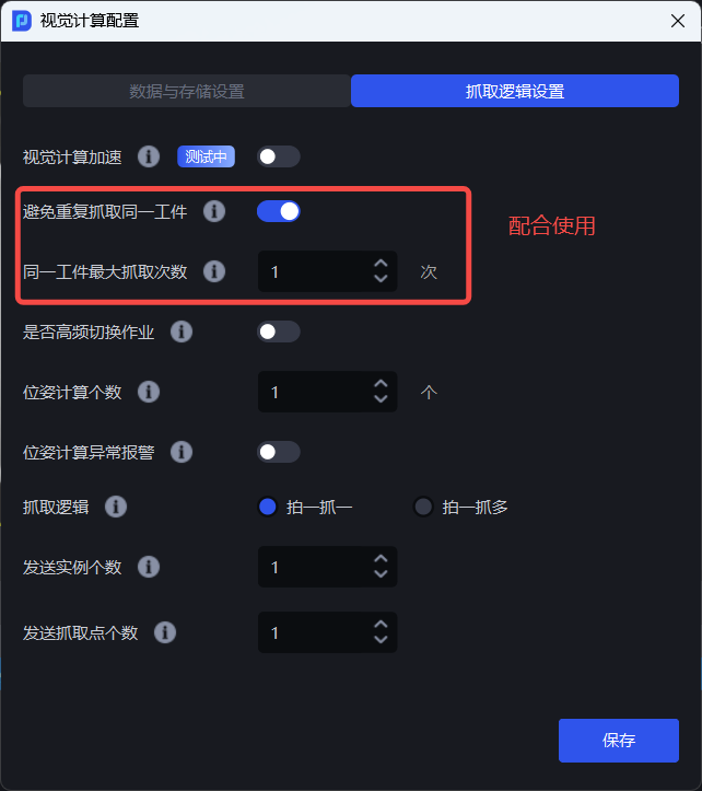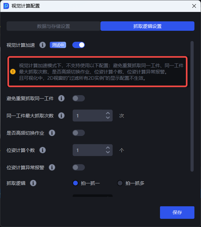 开启 “视觉计算加速” 模式时,“避免重复抓取同一工件”、“同一工件最大抓取次数”、“是否高频切换作业”、“位姿计算个数”、“位姿计算异常报警”无法生效。