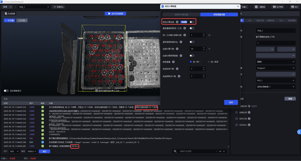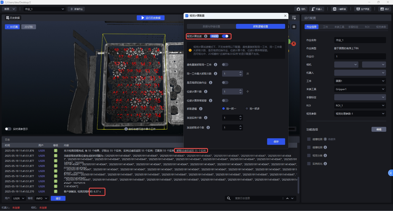 开启后,视觉计算的耗时较小,且默认识别所有视野内工件实例,适用于工件实例数量较多且节拍不满足要求的场景。如下图所示,未开启视觉计算加速时,检测出55个实例,耗时20.5 s;开启视觉计算加速后,同样检测出55个实例,耗时仅有6.37 s。
