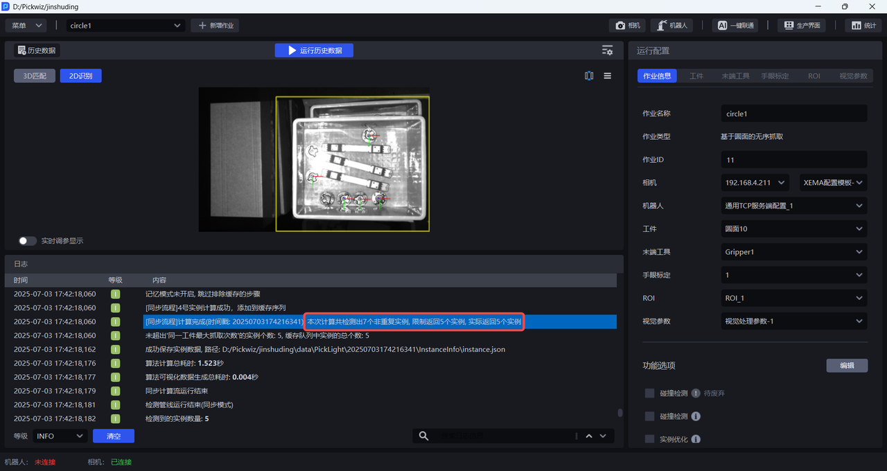 如下图所示,当发送实例个数设置为1时, PickWiz 每次发送1个实例的视觉结果给机器人。