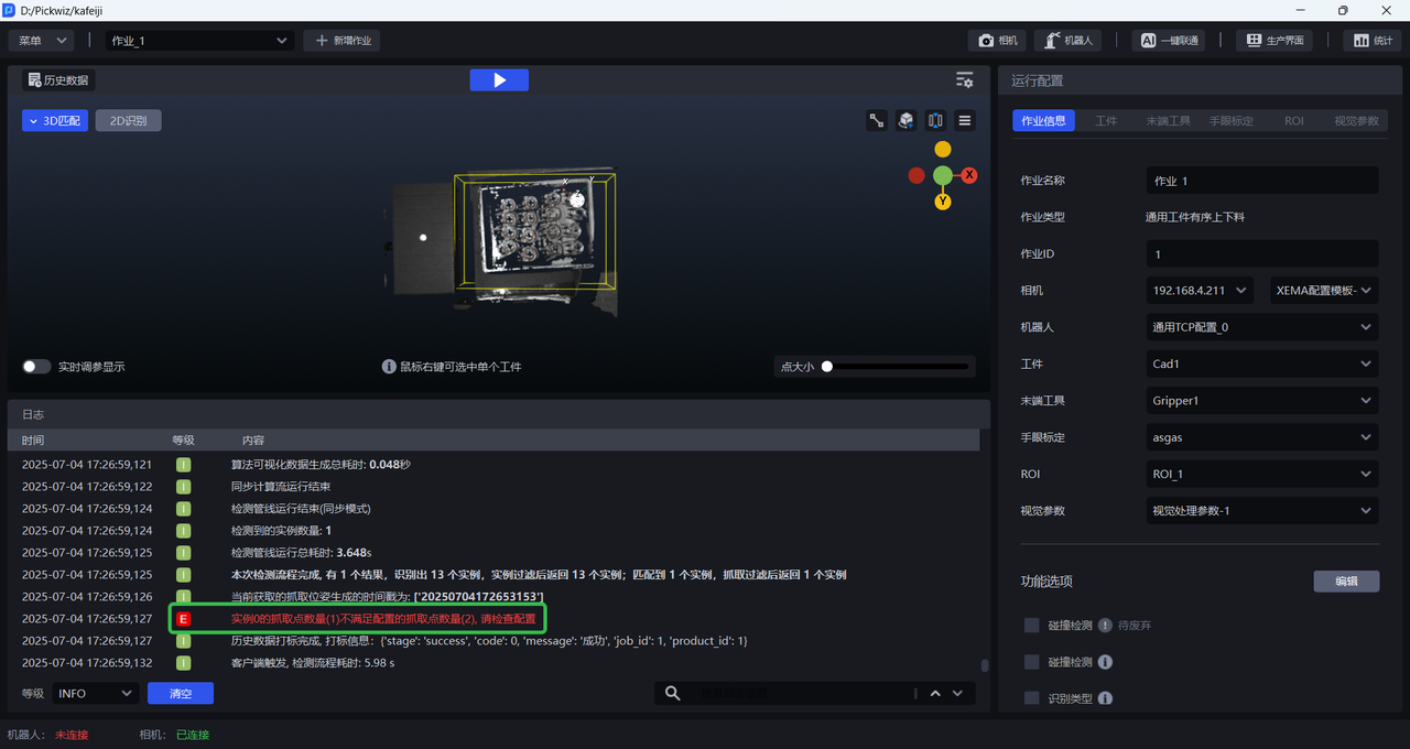 如下图所示,在通用工件有序上下料场景中,每个实例只生成了1个抓取点,发送抓取点个数却设置为2,运行后会报错“实例的抓取点数量不满足配置的抓取点数量,请检查配置”。