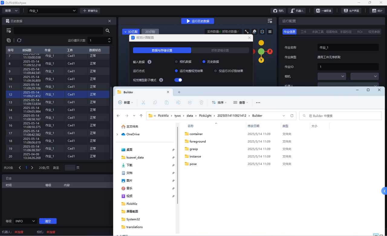 历史数据是 Pickwiz 过去一段时间内的运行记录,保存了视觉计算各个过程的输入数据和输出结果,用于排查故障原因,如下图所示,具体说明请查阅 历史数据使用指南。