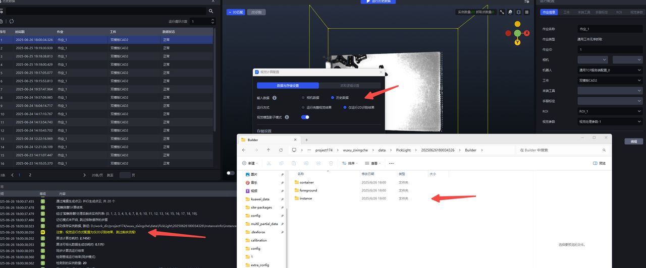 (4)选中一条历史数据,再点击 运行历史数据 按钮,即可将历史数据输入到工作流中进行视觉计算,最后输出抓取点, 日志 开头会显示数据来源为历史数据,如下图所示。