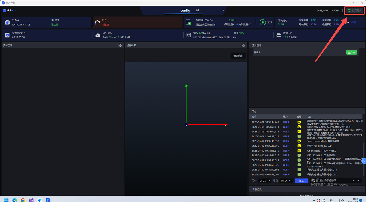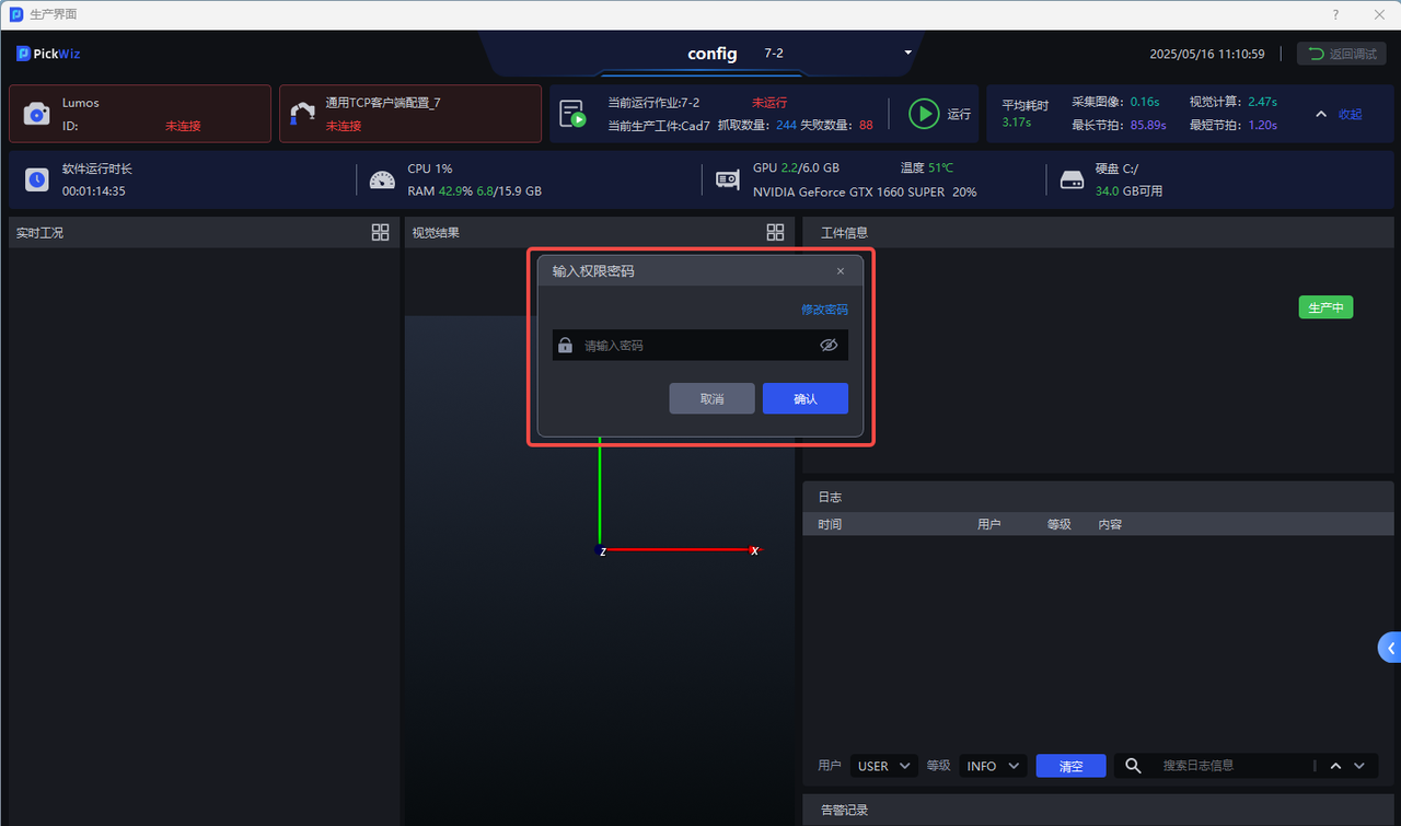 如果运行中出现异常,或希望实现来料增产,需返回PickWiz主界面进行调试,可点击生产界面右上角返回调试,输入权限密码后返回主界面。初始权限密码为出厂设置的密码,可在“输入权限密码”弹窗中自行修改。