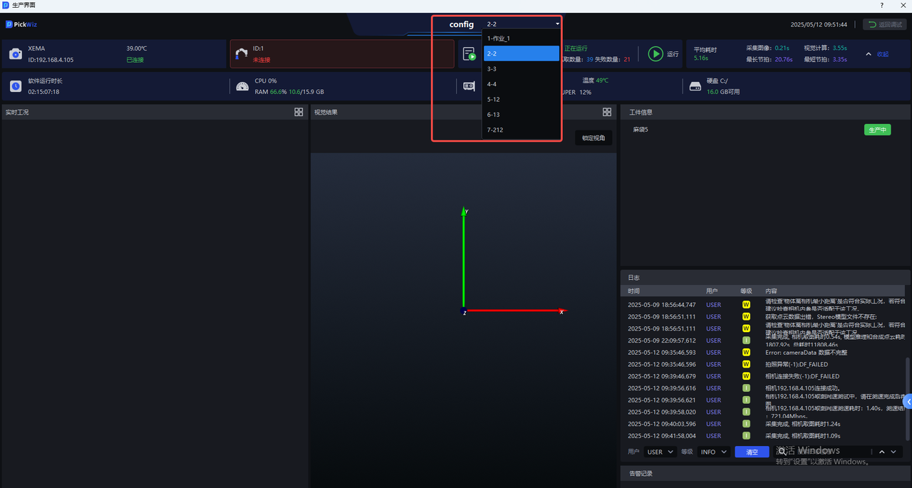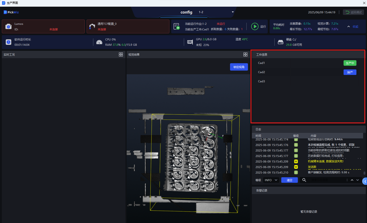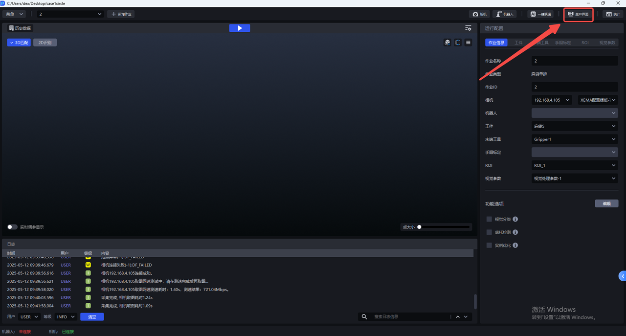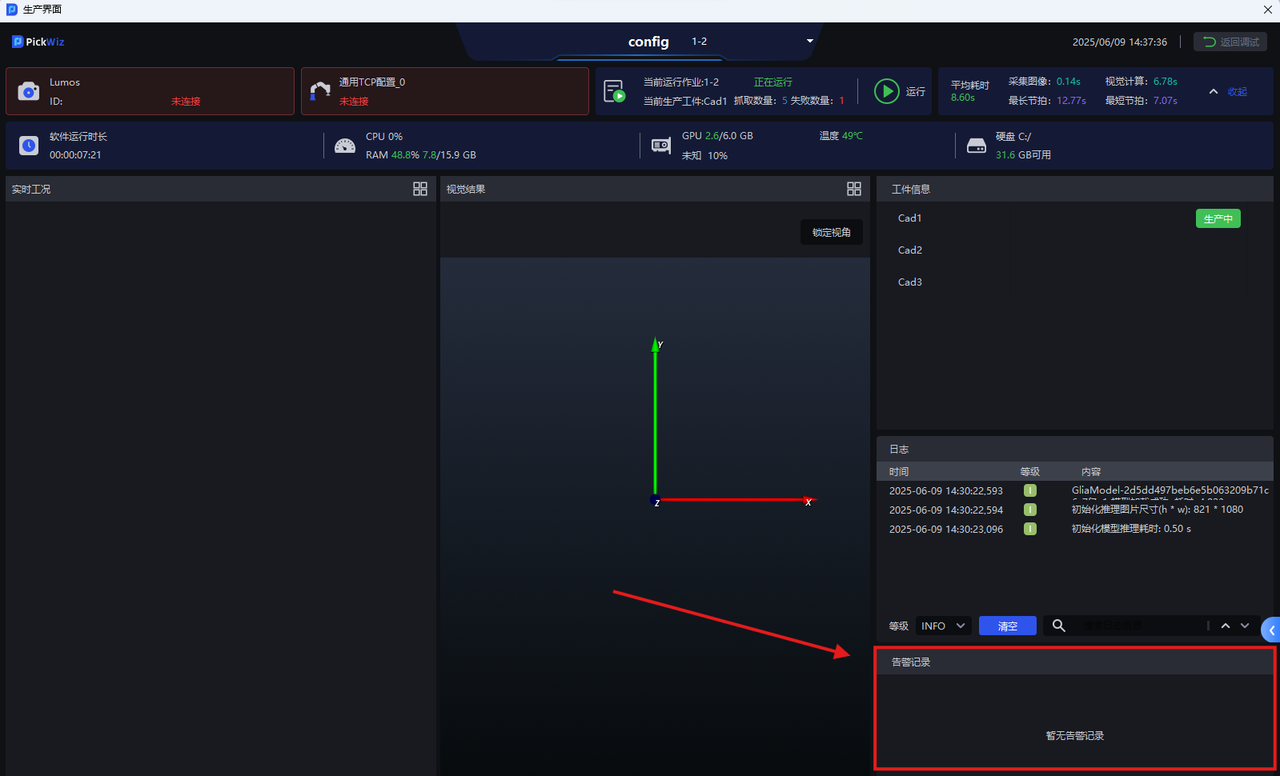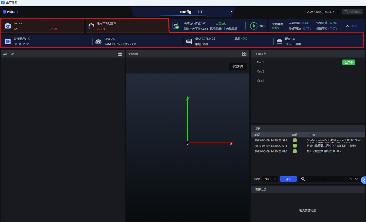 | ② | 生产状态区 | 查看相机连接状态、机器人连接状态、硬盘空间、系统监控状态等 |