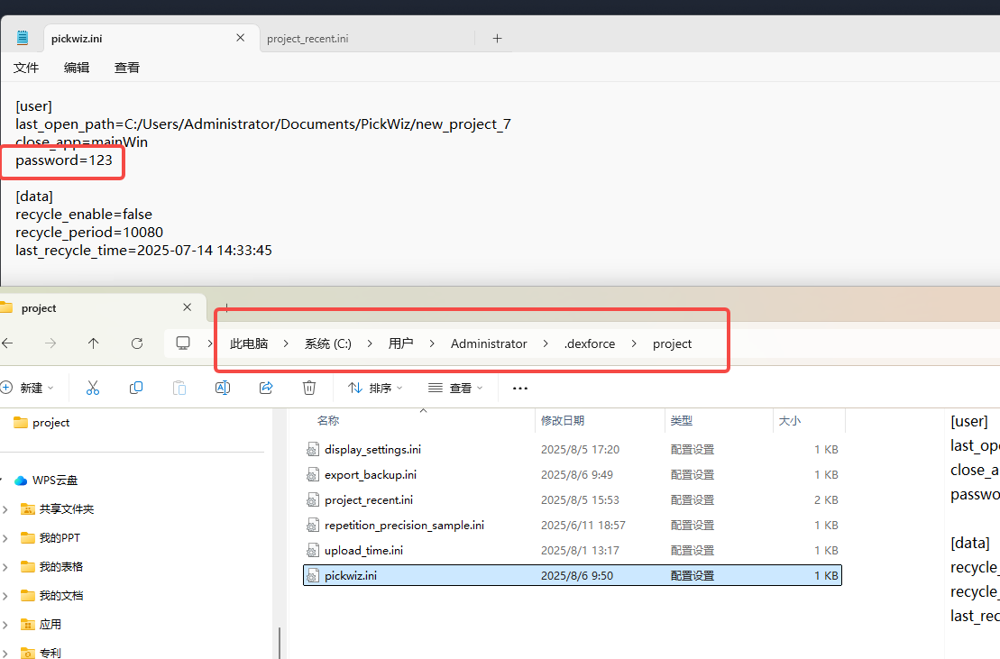 若忘记密码,可在 C:\Users\dex\.dexforce\project 文件夹中打开名称为 pickwiz.ini 的文件,查看生产界面你的权限密码,如下图所示。