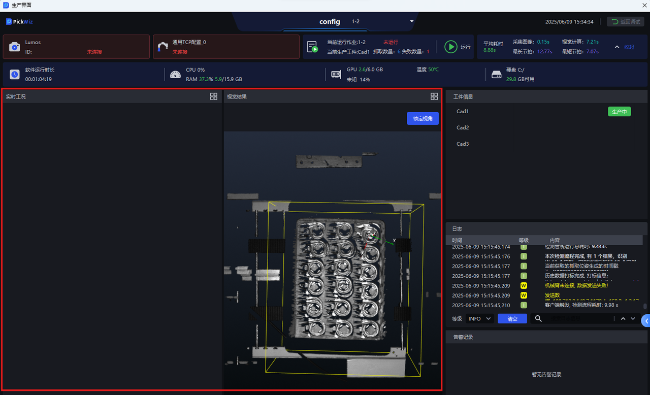 | ③ | 可视化区 | 查看工位实况、识别结果、抓取位姿、抓取顺序等 |