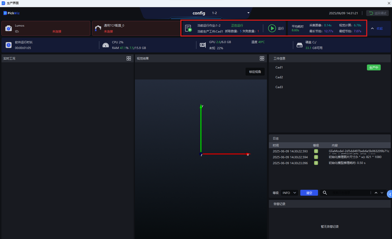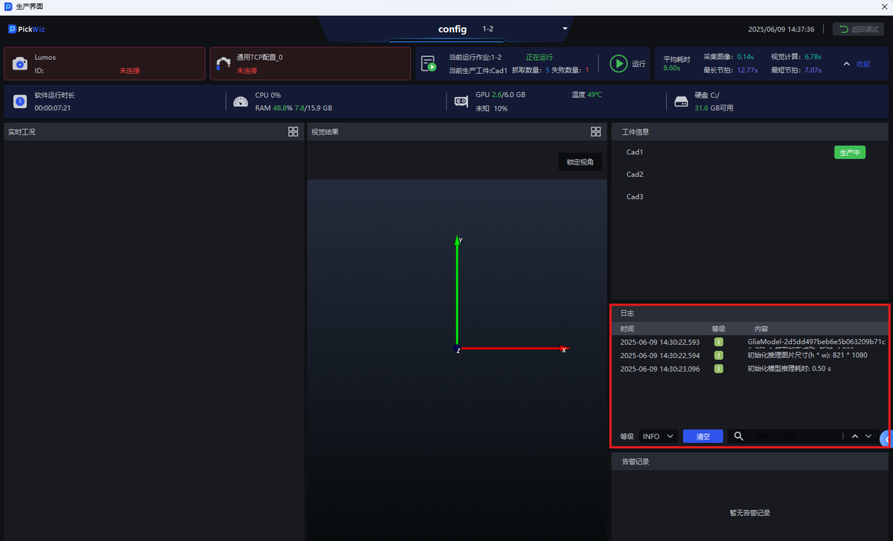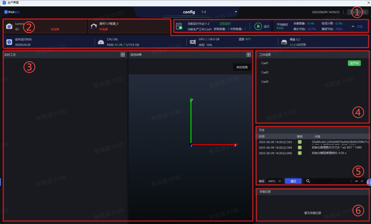 | ⑤ | 日志区 | 查看PickWiz视觉日志 |
