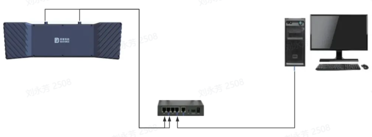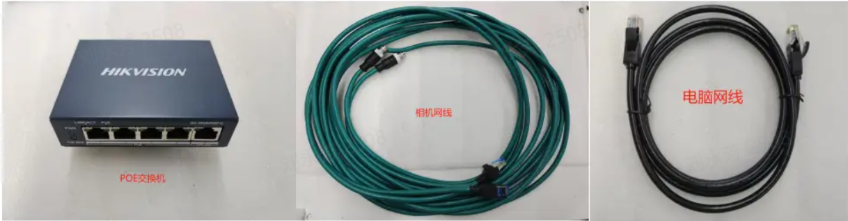相机通过网线与 POE 交换机相连,POE 交换机为相机供电,将电脑网线连接POE 交换机。