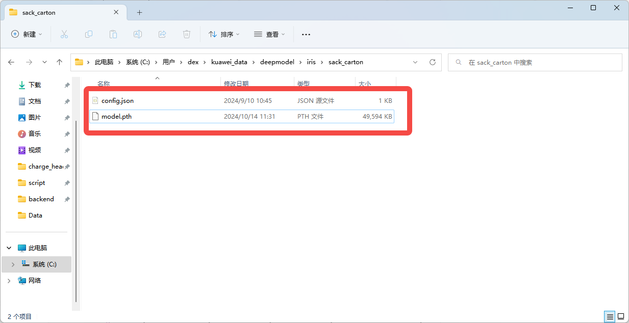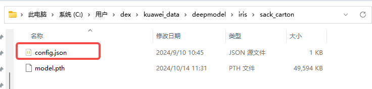 - 模型路径:kuawei_data->deepmodel->iris->sack_carton,没有此路径需手动新建