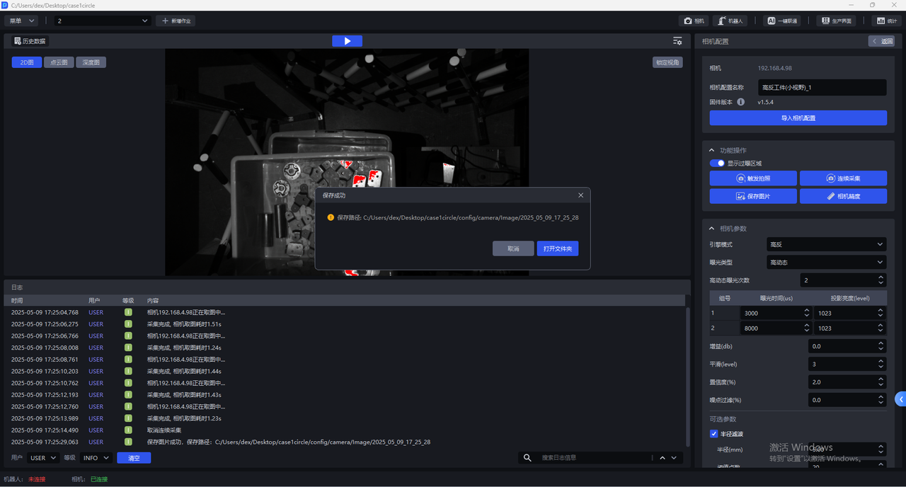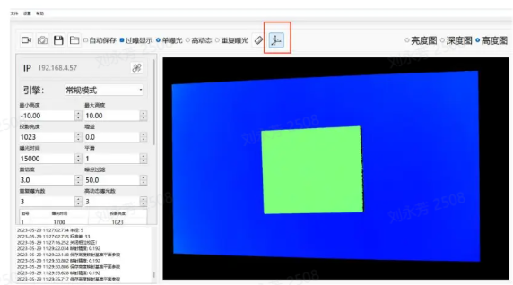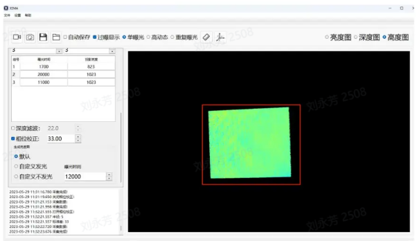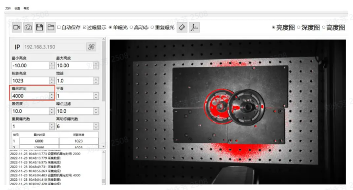 相机曝光时间:曝光时间是景物的反射光线通过镜头到达成像感光材料上,快门所要打开的时间。曝光时间越长,进入的光线越多。曝光时间过长则会出现过曝现象,从而影响点云,应结合实际调整大小