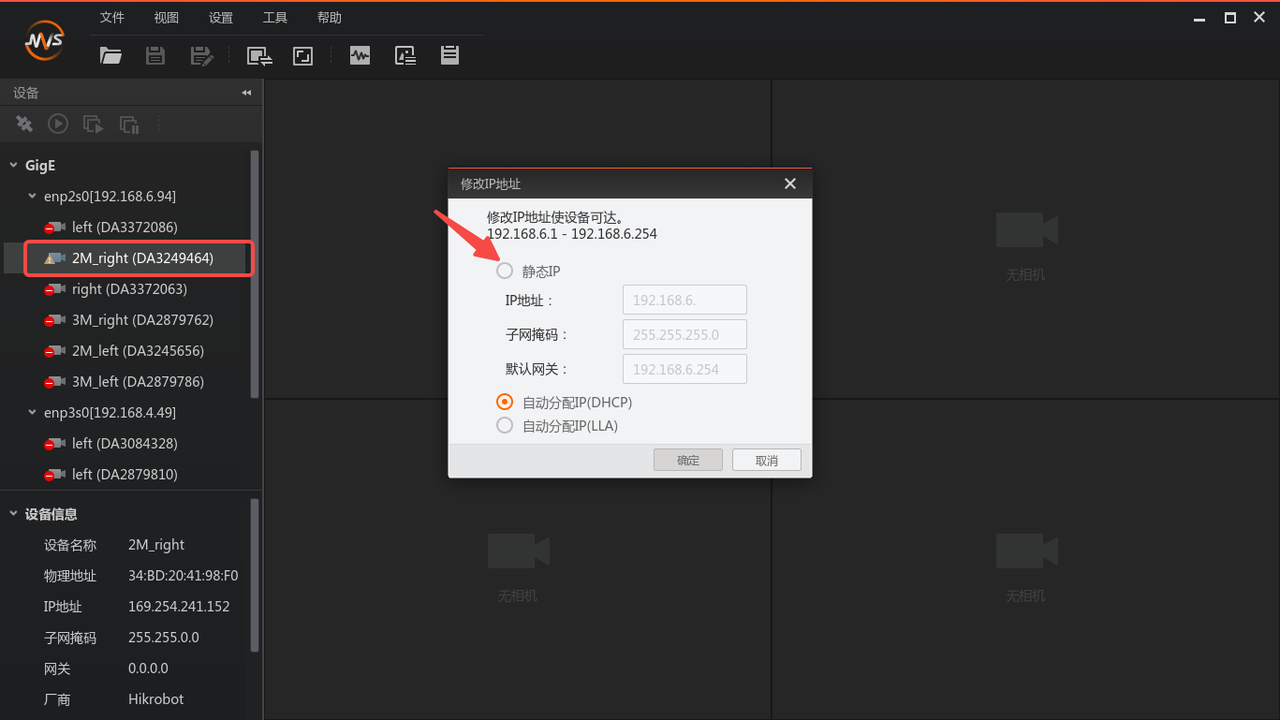 在MVS左侧查看相机列表,双击想连接的相机,若不可连接,则修改IP,相机IP需修改为与工控机同一网段