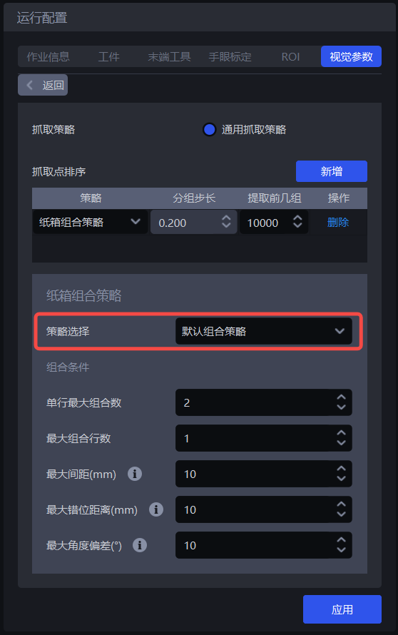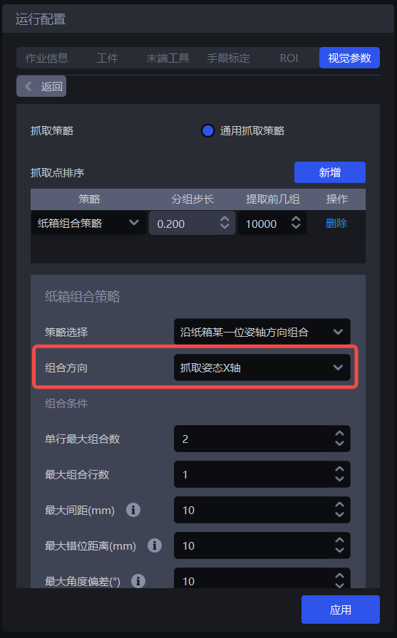 (3)策略选择:可选默认组合策略/沿纸箱位姿某一轴方向组合,两种找到可组合数量最多的纸箱的方式。