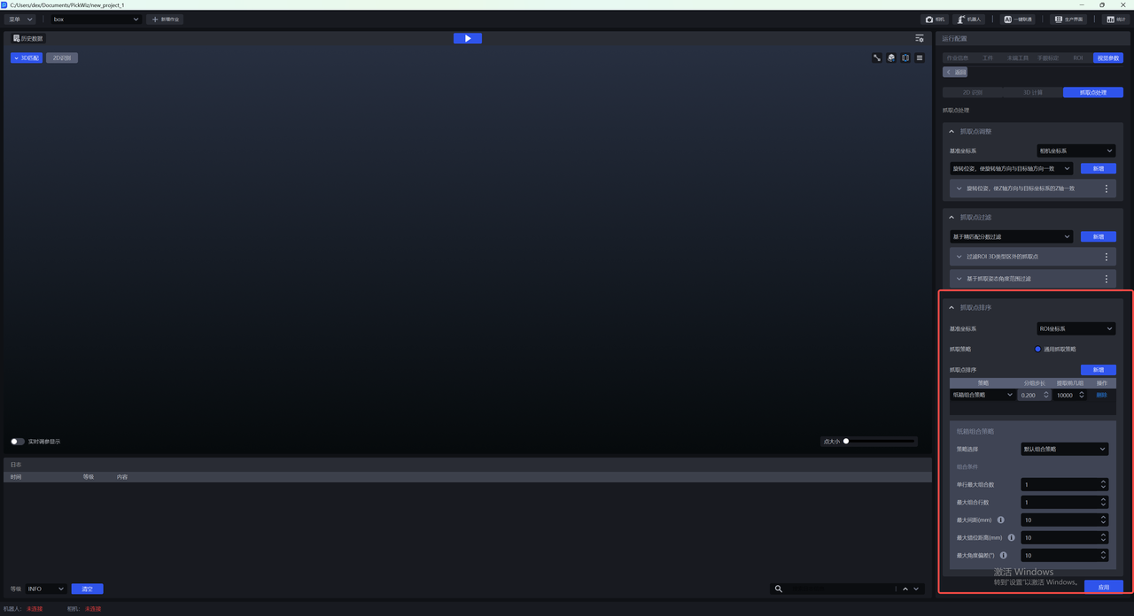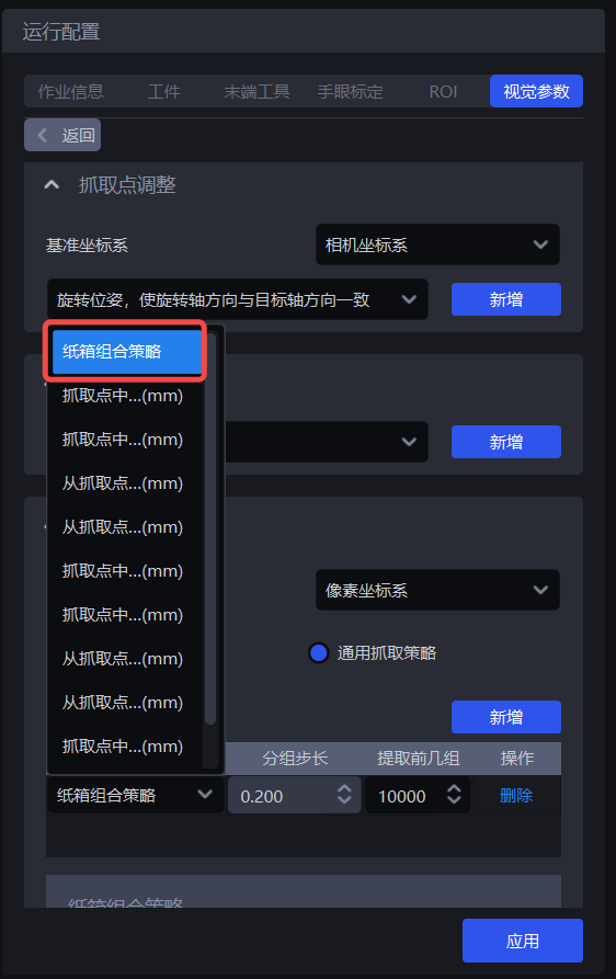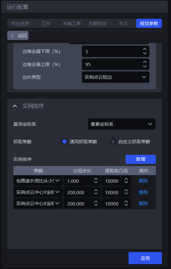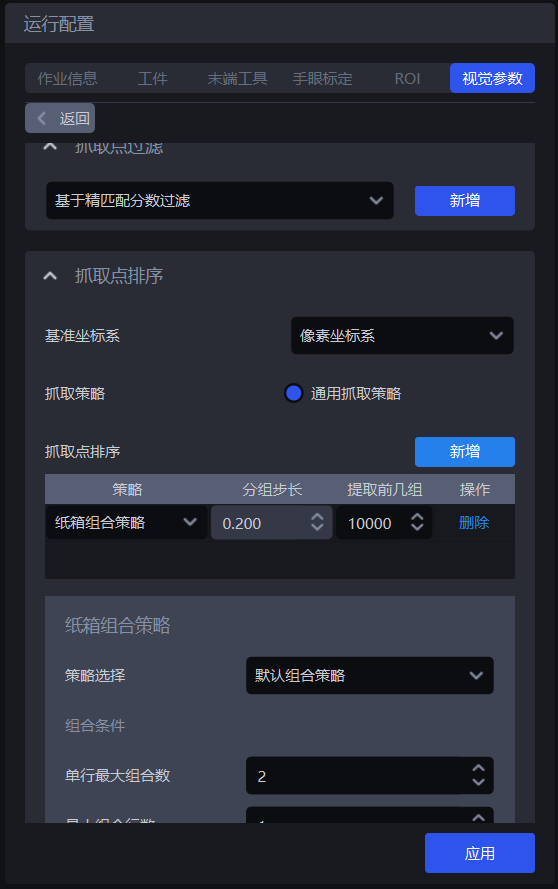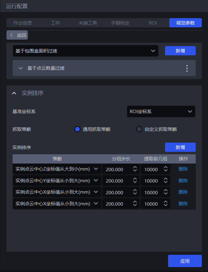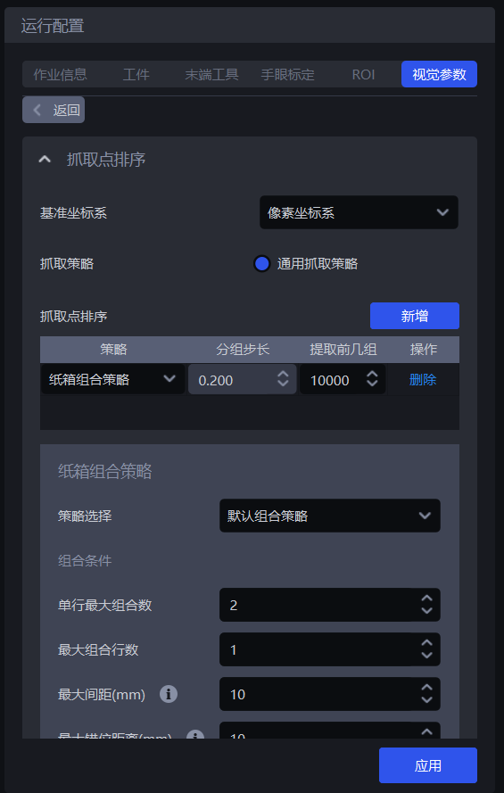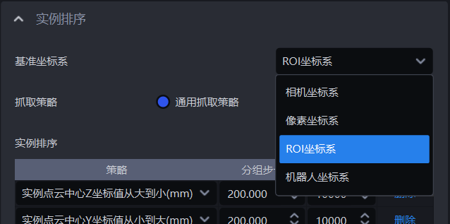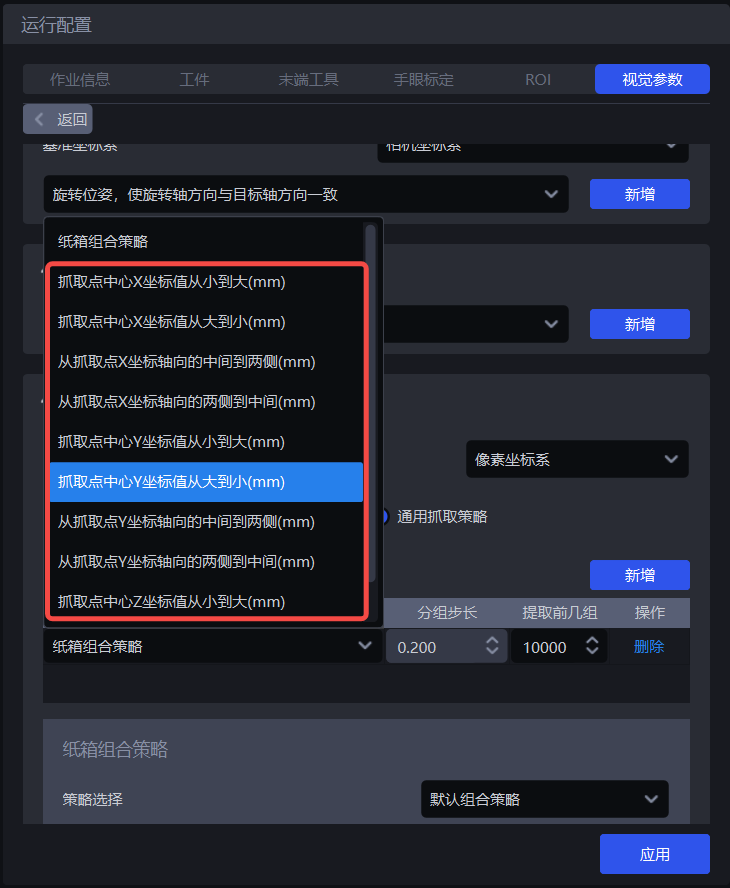 | 策略 | 选择依据哪个值进行分组排序以及如何排序,包括抓取点中心X/Y/Z坐标值从大到小/从小到大(mm)、从抓取点XY坐标轴向的中间到两侧/从两侧到中间(mm)可叠加多条,按顺序依次执行 |