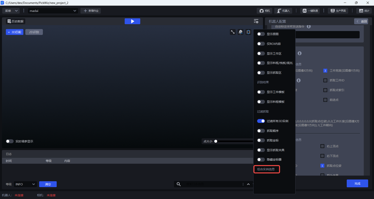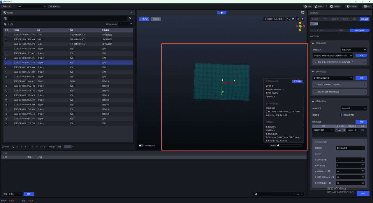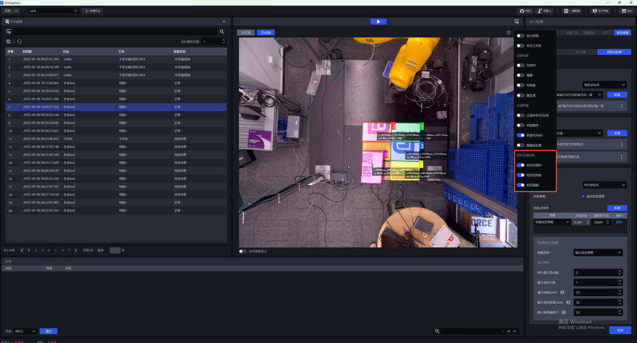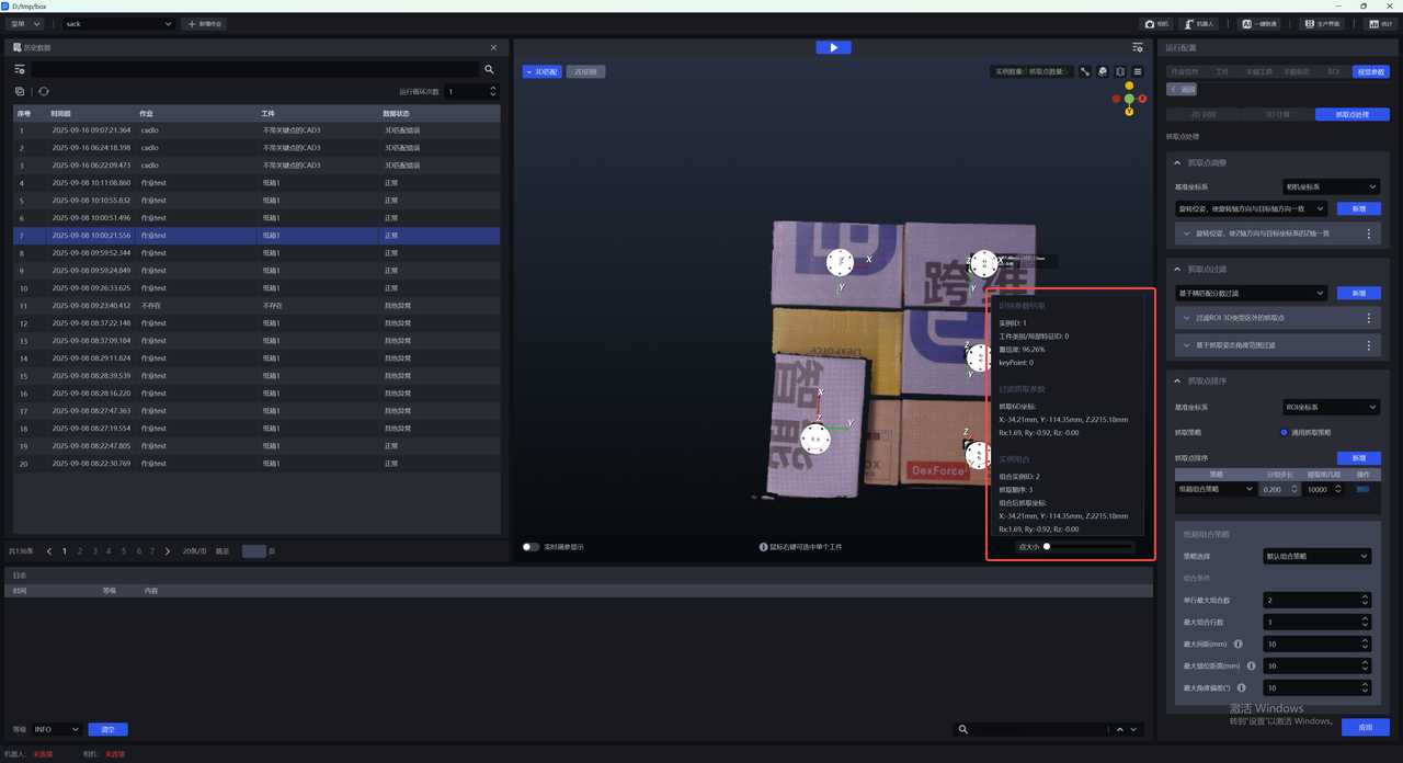 (1)在3D匹配视窗,将鼠标悬浮在实例上,可以查看到纸箱组合后单个实例的组合抓取信息,包含2D识别结果,抓取位姿和实例组合信息。