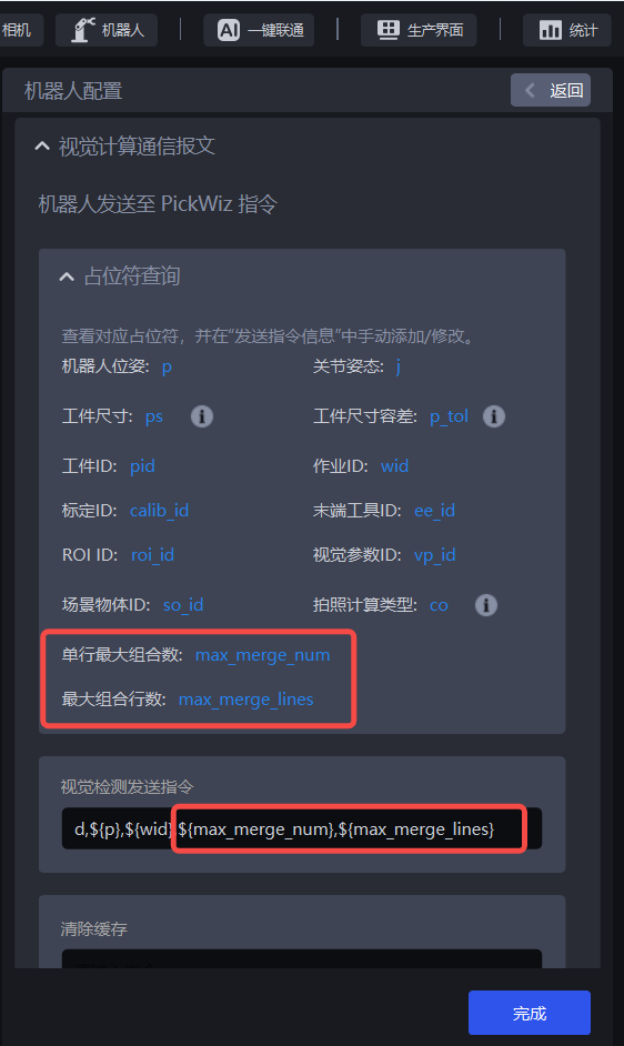 (1)在机器人配置界面,在视觉计算通信报文-机器人发送至PickWiz指令-视觉检测发送指令中新增占位符:单行最大组合数与最大组合行数,如下图所示;