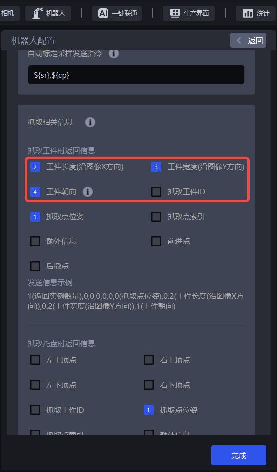 (2)在视觉计算通信报文-PickWiz发送至机器人指令-抓取相关信息-抓取工件时返回信息中,新增工件长度、工件宽度与工件朝向。