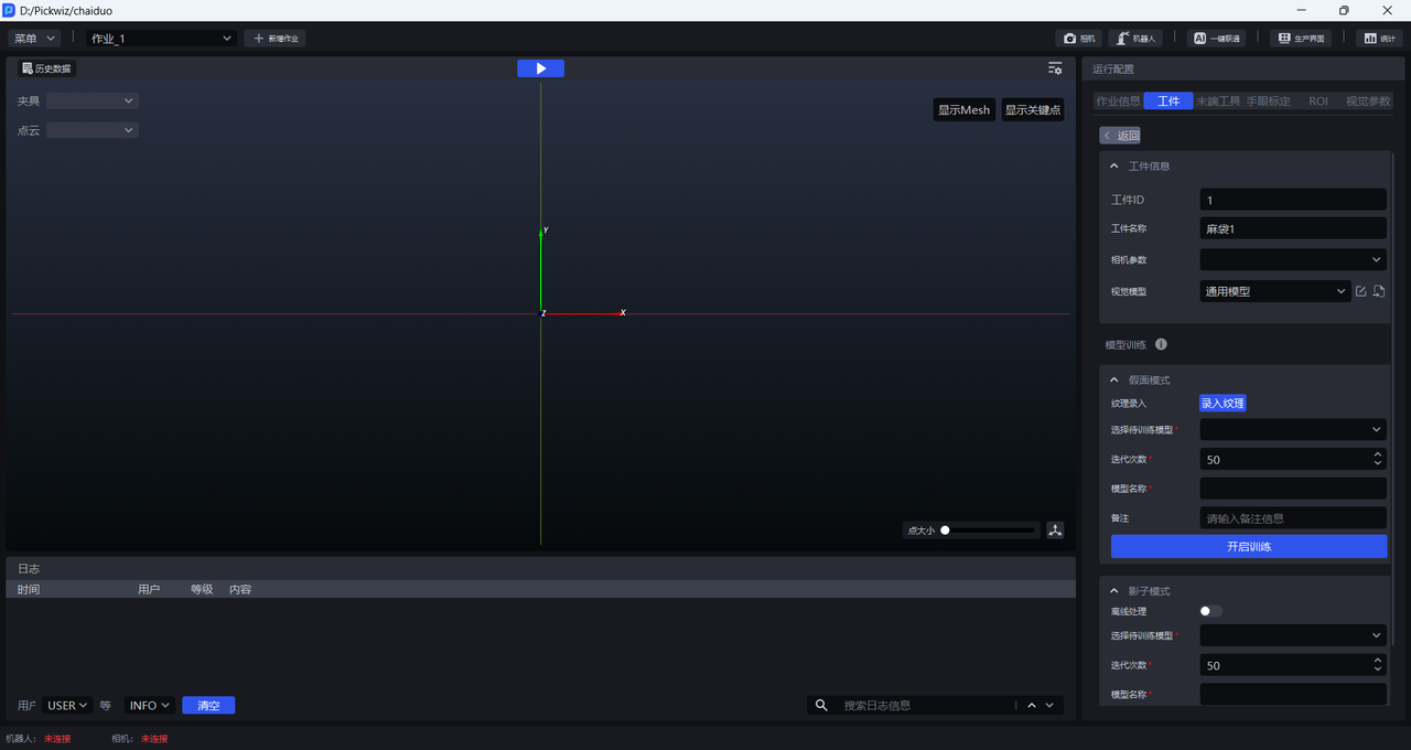 视觉模型为通用的麻袋模型(麻袋单拆------通用麻袋模型、纸箱单拆------通用纸箱单拆模型、纸箱混拆------通用纸箱混拆模型),如果视觉分割效果不佳,可以根据实际情况自行训练模型。训练模型有两种方式:假面模式与影子模式。如果麻袋表面图案较少,可以用假面模式提升对特定纹理的识别,训练时长约1小时;如果麻袋表面图案较多,实例分割成功率已达95%,期望实例分割成功率更高,可以用影子模式,训练时长约1小时。