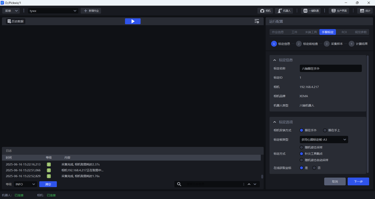标定流程结束,回到运行配置界面,点击作业信息,点击手眼标定的下拉框,选中对应手眼标定配置。