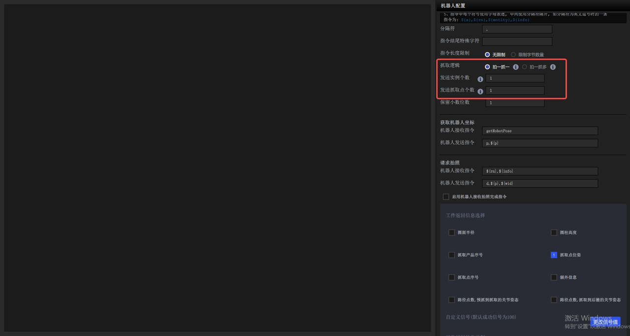 | 机器人配置 - 自定义报文格式![]() | 控制视觉给机器人发送的实例个数与每个实例的抓取点个数。 |
