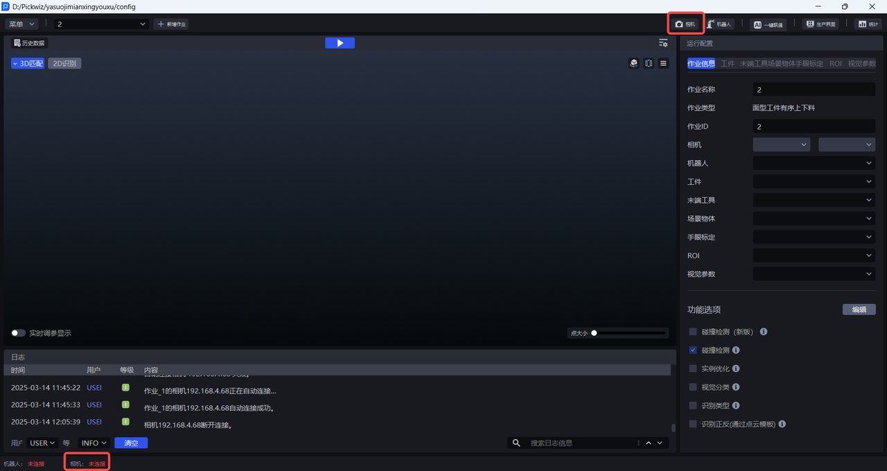 作业信息界面为当前作业选择相机,选择相机后,状态栏的相机连接状态变为"已连接",如下图所示。